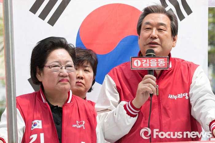 (서울=포커스뉴스) 김무성(오른쪽) 새누리당 대표가 10일 오전 서울 송파구 성내천 물빛광장에서 김을동(왼쪽) 송파병 지원유세를 하고 있다.