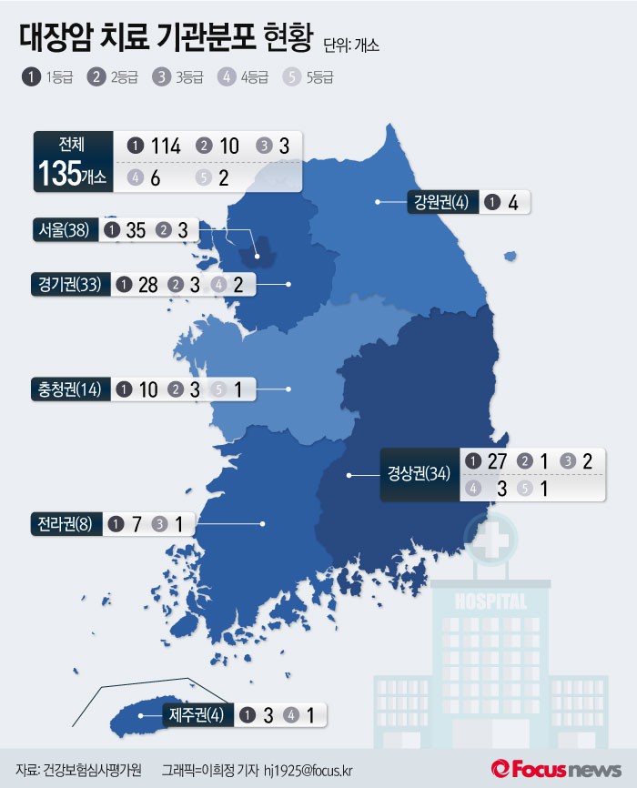 (서울=포커스뉴스) 건강보험심사평가원은‘4차 대장암 적정성 평가결과’를 11일 홈페이지에 공개한다고 10일 밝혔다. 암질환 중 사망률 4위를 차지하고 있는 대장암 치료를 하는데 있어 적절한 진료를 하고 있는 1등급 병원은 114곳이며, 전국적으로 고루 분포돼 있는 것으로 나타났다.