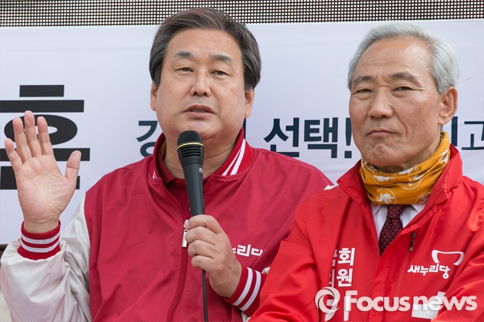 (서울=포커스뉴스) 김무성(왼쪽) 새누리당 대표가 10일 오후 서울 강남구 수서역 앞에서 이종구 강남갑, 김종훈(오른쪽) 강남을, 이은재 강남병 합동 지원유세를 하고 있다.