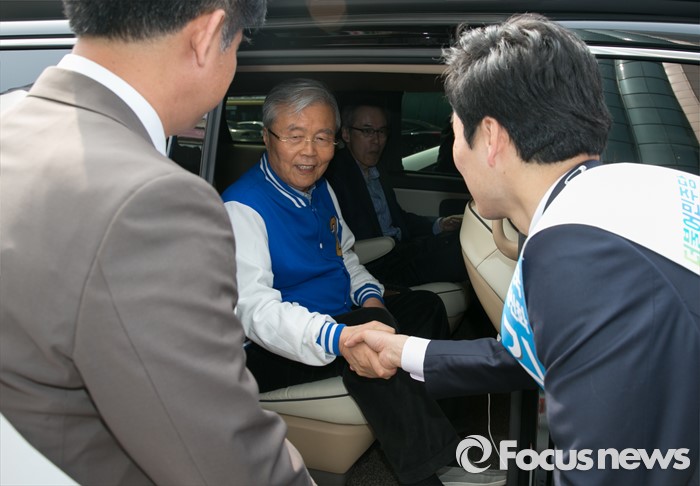 (성남=포커스뉴스) 10일 오후 경기도 성남 미금역 앞에서 더불어민주당 분당 합동유세를 마친 김종인(가운데) 비대위 대표 겸 선대위원장이 김병관(오른쪽) 분당갑, 김병욱 분당을 후보와 악수하고 있다.