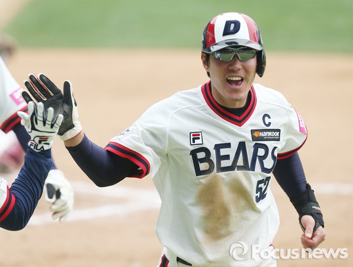 (서울=포커스뉴스) 10일 서울 잠실구장에서 열린 2016 프로야구 넥센-두산 경기 4회말 2사 만루에서 두산 정수빈의 2타점 안타때 홈인한 2루주자 김재호가 환호하고 있다.