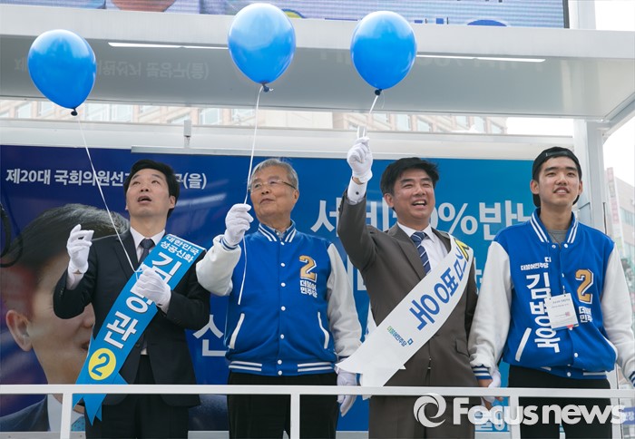 (성남=포커스뉴스) 10일 오후 경기도 성남 미금역 앞에서 열린 더불어민주당 분당 합동유세에 참석한 김종인 비대위 대표 겸 선대위원장과 후보들이 풍선을 날리는 퍼포먼스를 준비하고 있다. 왼쪽부터 김병관 분당갑 후보, 김 대표, 김병욱 분당을 후보, 김병욱 후보 아들.