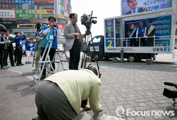 (성남=포커스뉴스) 10일 오후 경기도 성남 미금역 앞에서 열린 더불어민주당 분당 합동유세에 참석한 김종인 비대위 대표 겸 선대위원장과 후보들의 선거유세를 지켜보던 한 어르신이 절을 하고 있다.