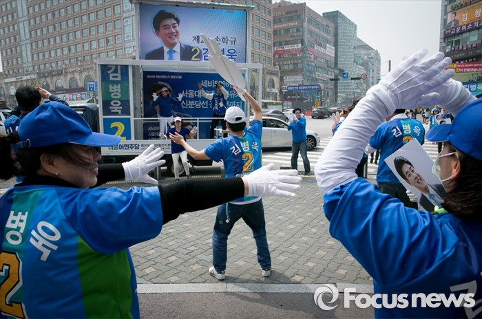 (성남=포커스뉴스) 10일 오후 경기도 성남 미금역 앞에서 열린 더불어민주당 분당 합동유세에 참여한 선거운동원들이 로고송에 맞춰 율동을 선보이고 있다.