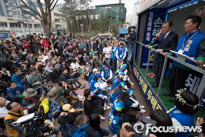 (서울=포커스뉴스) 문재인 더불어민주당 전 대표가 10일 오후 서울 마포구 홍익대학교 앞에서 손혜원 더불어민주당 마포을 후보의 지지를 호소하고 있다.