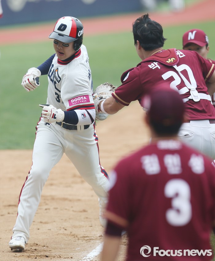 (서울=포커스뉴스) 10일 서울 잠실구장에서 열린 2016 프로야구 넥센-두산 경기 6회말 1사 3루에서 두산 허경민의 3루 땅볼때 3루주자 박건우가 협살에 걸려 아웃되고 있다.