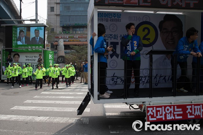 (서울=포커스뉴스) 20대 총선을 3일 앞둔 10일 오후 서울 성동구 옥수역 인근에서 정호준 국민의당 중구성동을 후보측이 선거운동을 하던 중 이지수 더불어민주당 후보측 차량이 지나가고 있다.