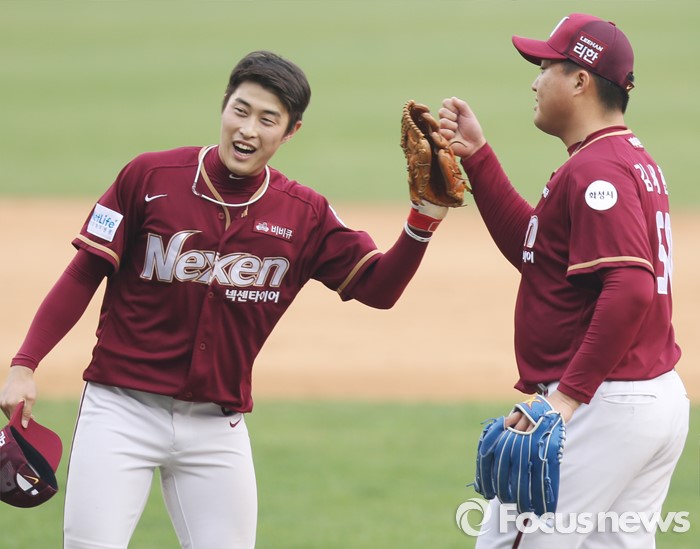 (서울=포커스뉴스) 10일 서울 잠실구장에서 열린 2016 프로야구 넥센-두산 경기에서 두산에 역전승한 넥센 장시윤(왼쪽)과 채태인이 승리의 기쁨을 나누고 있다.