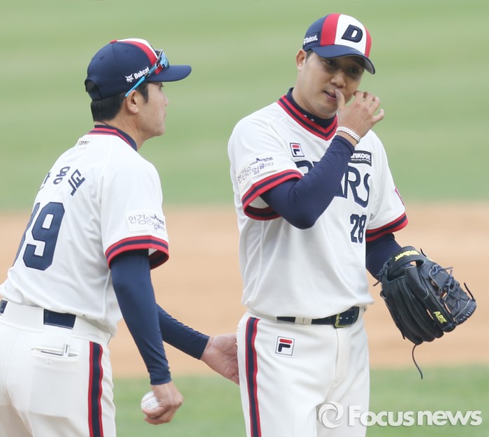 (서울=포커스뉴스) 10일 서울 잠실구장에서 열린 2016 프로야구 넥센-두산 경기 7회초 2사 1,3루에서 두산 투수 장원준이 투수교체로 마운드에서 내려오고 있다.