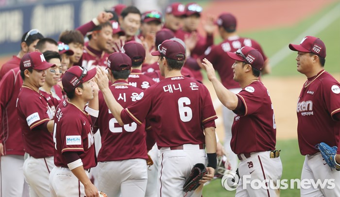 (서울=포커스뉴스) 10일 서울 잠실구장에서 열린 2016 프로야구 넥센-두산 경기에서 두산에 역전승한 넥센 선수들이 하이파이브를 하며 승리의 기쁨을 나누고 있다.