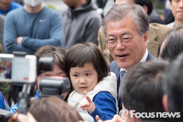 | △ 어린이와 함께 기념촬영 하는 문재인 |