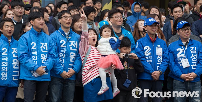 (서울=포커스뉴스) 10일 오후 서울 CGV 강남점 앞에서 한 시민이 문재인 더불어민주당 전 대표, 김성곤 강남갑 후보, 전원근 강남병 후보, 이정근 서초갑 후보, 김기영 서초을 후보의 유세를 지켜보며 손가락으로 2번을 만들고 있다.