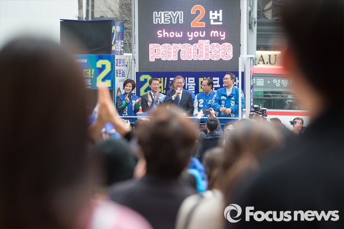 (서울=포커스뉴스) 10일 오후 서울 강남구 CGV 강남점 앞에서 이정근(왼쪽부터) 더불어민주당 서초갑 후보, 전원근 강남병 후보, 문재인 전 대표, 김성곤 강남갑 후보, 김기영 서초을 후보와 함께 유권자들에게 지지를 호소하고 있다.