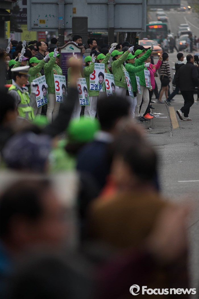 (서울=포커스뉴스) 20대 총선을 사흘 앞둔 10일 오후 서울 은평구 불광역 인근에서 유권자들이 안철수 국민의당 공동대표와 고연호 은평구을 후보와 합동유세를 지켜보고 있다.