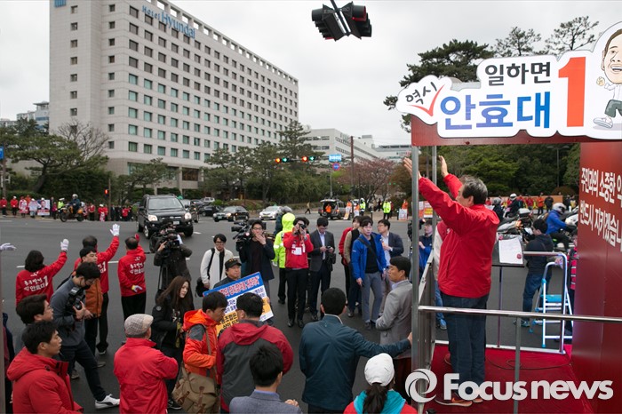(울산=포커스뉴스) 김무성 새누리당 대표가 11일 오전 울산시 동구 현대중공업 앞에서 안효대 울산 동구 후보 지원유세를 하고 있다.