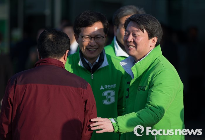 (인천=포커스뉴스) 안철수 국민의당 상임공동대표(오른쪽)가 인천 서구갑 유길종 후보와 서구을 허영 후보와 함께 11일 아침 인천시 서구 검암역에서 출근인사를 하고 있다.