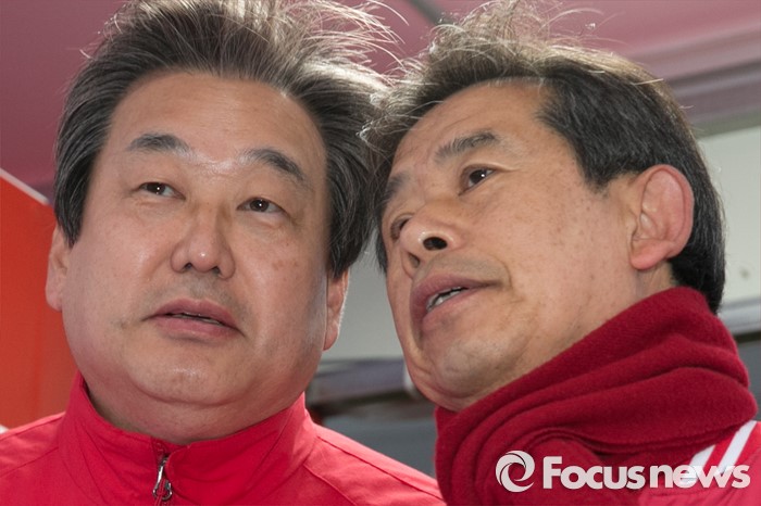 (울산=포커스뉴스) 김무성(왼쪽) 새누리당 대표가 11일 오전 울산시 동구 현대중공업 앞에서 안효대 울산 동구 후보 지원유세를 하며 대화하고 있다.