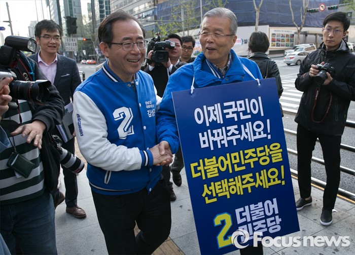 (서울=포커스뉴스) 20대 총선을 이틀 앞둔 11일 오전 서울 지하철 선릉역 인근 거리에서 투표참여 캠페인을 마친 김종인(오른쪽) 더불어민주당 비대위 대표 겸 선대위원장이 김성곤 강남갑 후보와 인사하고 있다.