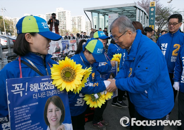 (서울=포커스뉴스) 20대 총선을 이틀 앞둔 11일 오전 서울 지하철 수서역 인근 거리에서 김종인 더불어민주당 비대위 대표 겸 선대위원장이 전현희 강남을 후보의 선거운동원들을 격려하고 있다.