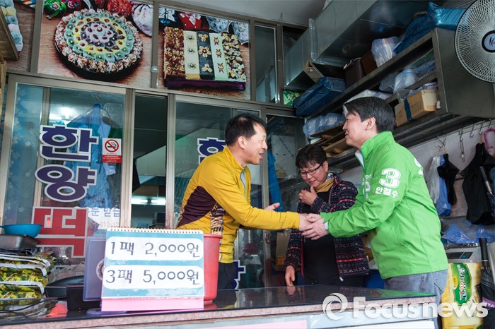 (인천=포커스뉴스) 안철수 국민의당 상임공동대표가 11일 오전 인천시 계양구 계양역 앞에서 계양구을 최원식 후보, 계양구갑 이수봉 후보 합동 지원 유세를 하던 중 한 상인과 인사를 나누고 있다.