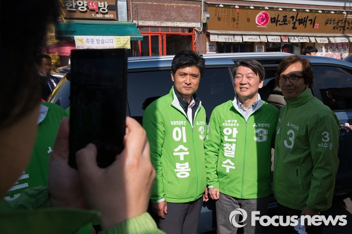 (인천=포커스뉴스) 안철수 국민의당 상임공동대표가 11일 오전 인천시 계양구 계양역 앞에서 계양구을 최원식 후보, 계양구갑 이수봉 후보 합동 지원 유세를 하던 중 기념사진을 찍고 있다.