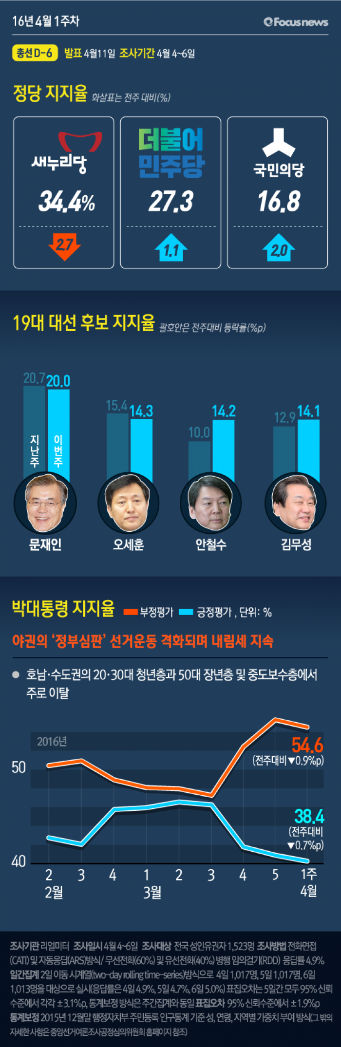 이번 주중집계는 2016년 4월 4일부터 6일까지 3일간 전국 19세 이상 유권자 1,523명을 대상으로 전화면접(CATI) 및 자동응답(ARS) 방식으로 무선전화(60%)와 유선전화(40%) 병행 임의걸기(RDD) 방법으로 조사했고, 응답률은 4.9%이다. 통계보정은 2015년 12월말 행정자치부 주민등록 인구통계 기준 성, 연령, 권역별 가중치 부여 방식으로 이루어졌고, 표본오차는 95% 신뢰수준에서 ±2.5%p이다. 일간집계는 ‘2일 이동 시계열(two-day rolling time-series)’ 방식으로 4일 1,017명, 5일 1,017명, 6일 1,013명을 대상으로 실시했고, 응답률은 4일 4.9%, 5일 4.7%, 6일 5.0%, 표본오차는 3일간 모두 95% 신뢰수준에서 각각 ±3.1%p이다. 일간집계의 통계보정 방식은 주간집계와 동일하다.
