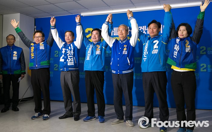 (수원=포커스뉴스) 20대 총선을 이틀 앞둔 11일 오전 수원 장안구 더불어민주당 경기도당 회의실에서 김종인 비대위 대표 겸 선대위원장이 수원 후보들과 대국민 성명 발표를 마친 뒤 손을 잡고 포즈를 취하고 있다. 왼쪽부터 박광온 수원정, 이찬열 수원갑, 김진표 수원무 후보, 김 대표, 김영진 수원병, 백혜련 수원을 후보.
