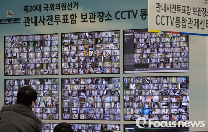 (과천=포커스뉴스) 4.13 총선을 이틀 앞둔 11일 오전 경기 과천 중앙선거관리위원회 내 관내사전투표함 보관장소 CCTV통합관제센터에서 선관위 관계자들이 실시간으로 투표함을 감시하고 있다.