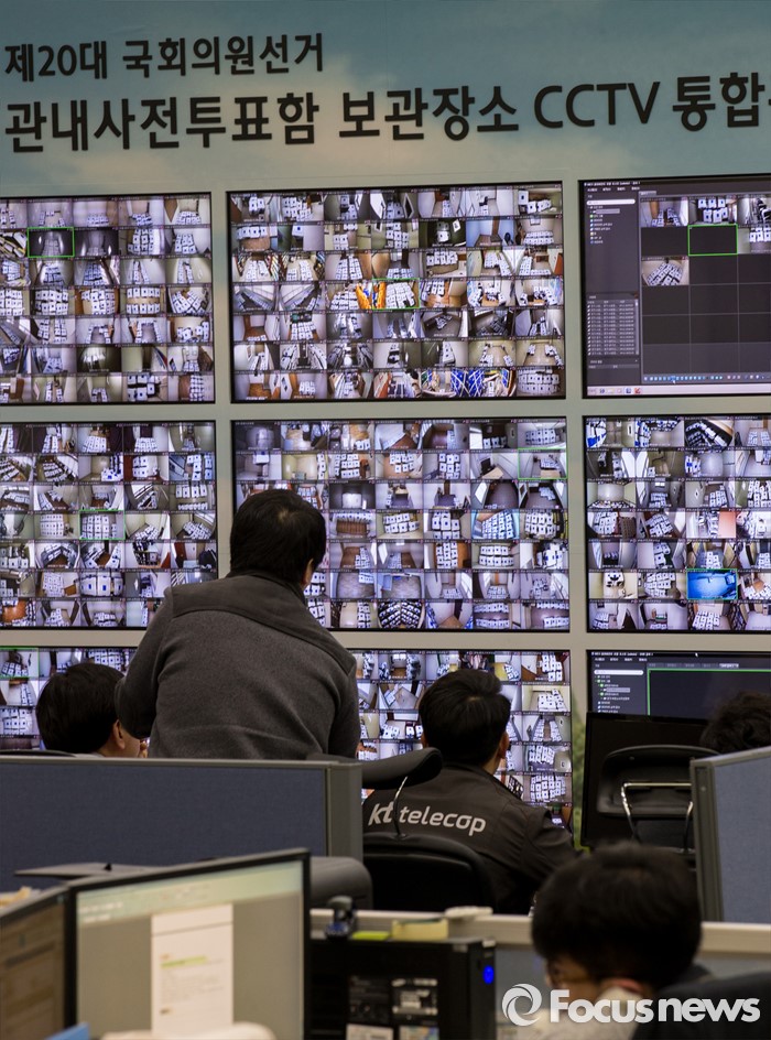 (과천=포커스뉴스) 4.13 총선을 이틀 앞둔 11일 오전 경기 과천 중앙선거관리위원회 내 관내사전투표함 보관장소 CCTV통합관제센터에서 선관위 관계자들이 실시간으로 투표함을 감시하고 있다.