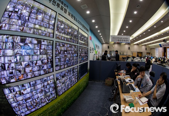 (과천=포커스뉴스) 4.13 총선을 이틀 앞둔 11일 오전 경기 과천 중앙선거관리위원회 내 관내사전투표함 보관장소 CCTV통합관제센터에서 선관위 관계자들이 실시간으로 투표함을 감시하고 있다.