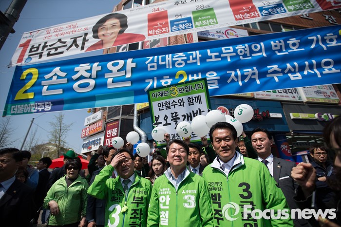 (안산=포커스뉴스) 안철수 국민의당 상임공동대표(가운데)가 11일 오전 안산시 단원구 고잔성당 사거리에서 부좌현 안산시 단원구을 후보 지원유세를 하고 있다.