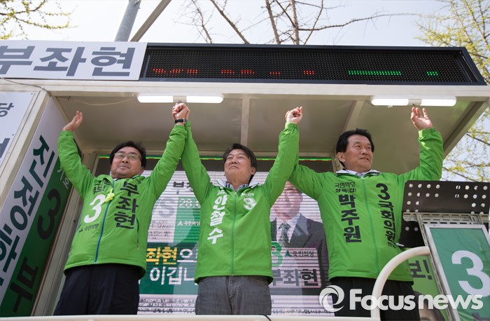 (안산=포커스뉴스) 안철수 국민의당 상임공동대표(가운데)가 11일 오전 안산시 단원구 고잔성당 사거리에서 부좌현 안산시 단원구을 후보 지원유세를 하고 있다.