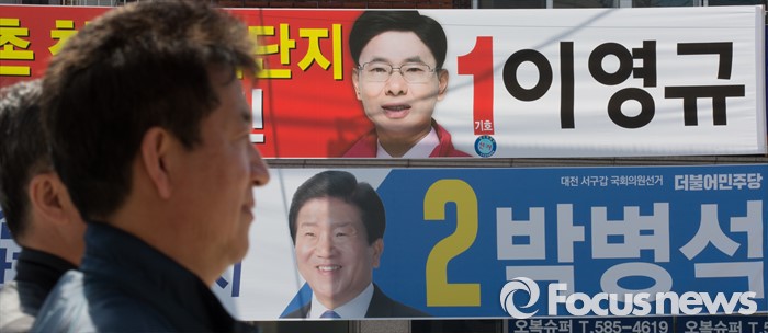 (대전=포커스뉴스) 20대 국회의원 선거를 이틀 남긴 11일 오전 대전 서구 흑석네거리에서 후보의 유세를 바라보는 시민 뒤로 새누리당 이영규, 더불어민주당 박병석 후보의 선거홍보 현수막이 붙어 있다.