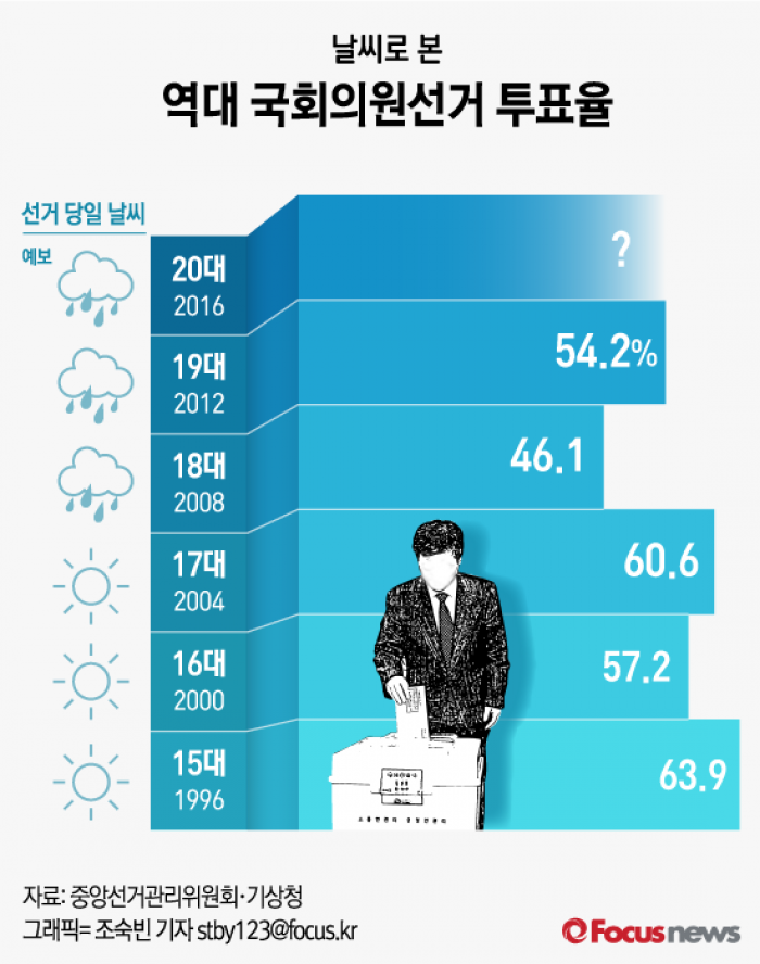 (서울=포커스뉴스) 민간기상업체 케이웨더는 지난 1996년 15대 총선부터 지난 2012년 19대 총선까지 5번의 총선 투표율과 날씨를 분석한 결과, 선거일에 비가 내린 경우 투표율이 낮았다고 발표했다.