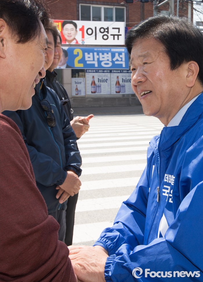 (대전=포커스뉴스) 20대 국회의원 선거를 이틀 남긴 11일 오전 대전 서구 흑석네거리에서 박병석 더불어민주당 후보가 시민들과 악수를 하고 지지를 호소하고 있다.