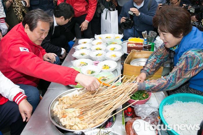 (부산=포커스뉴스) 제20대 총선에서 부산 중구영도에 출마한 김무성(왼쪽) 새누리당 대표가 11일 오후 부산 중구 국제시장 먹자골목 좌판 음식점에 앉아, 어묵을 주문하고 있다.