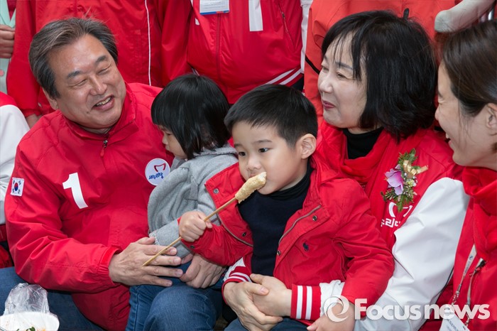 (부산=포커스뉴스) 제20대 총선에서 부산 중구영도에 출마한 김무성(왼쪽) 새누리당 대표가 11일 오후 부산 중구 국제시장 먹자골목 좌판 음식점에 앉아, 부인 최양옥 씨와 손자·손녀를 안고 음식을 먹고 있다. 오른쪽은 첫째딸 김현진 씨.