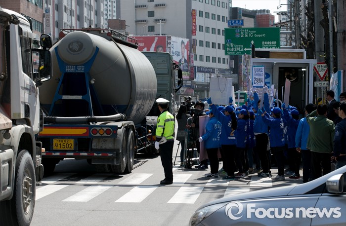 (군포=포커스뉴스) 20대 총선을 이틀 앞둔 11일 오후 경기도 군포 당동우체국 사거리에서 열린 더불어민주당 군포지역 합동유세에 불편을 겪는 차량들을 위해 경찰들이 교통정리를 하고 있다.