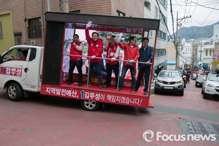 (부산=포커스뉴스) 제20대 총선에서 부산 중구영도에 출마한 김무성 새누리당 대표가 11일 오후 부산 중구 보수동 책방골목에서 유세차량을 타고 선거운동을 하고 있다.