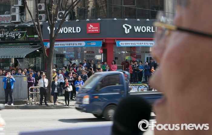(광명=포커스뉴스) 20대 총선을 이틀 앞둔 11일 오후 경기도 광명 하안사거리에서 김종인 더불어민주당 비대위 대표 겸 선대위원장이 이언주 광명을 후보의 지지를 호소하고 있다.