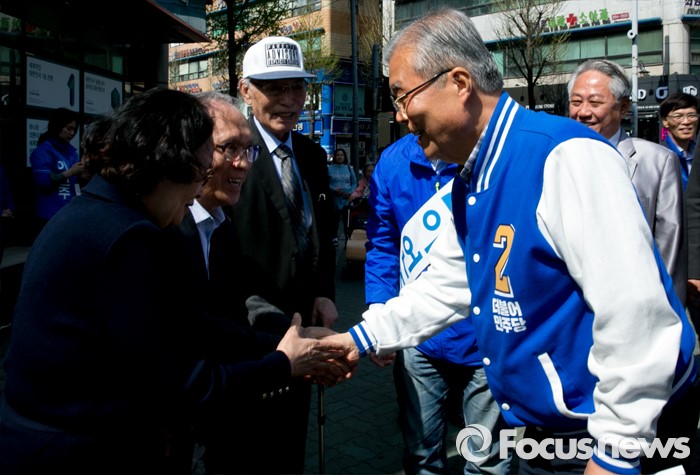 (광명=포커스뉴스) 20대 총선을 이틀 앞둔 11일 오후 경기도 광명 하안사거리에서 김종인(오른쪽) 더불어민주당 비대위 대표 겸 선대위원장이 이언주 광명을 후보의 유세를 마친 뒤 유권자들과 인사하며 지지를 호소하고 있다.