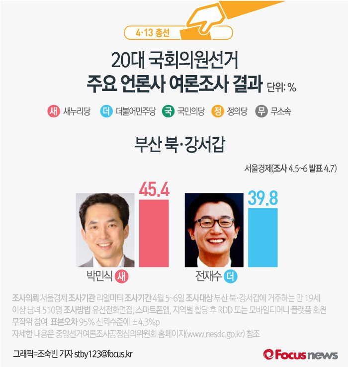 반면 이보다 앞서 MBC가 리서치앤리서치에 의뢰해 5일 발표한 결과에 따르면 전재수 후보의 지지율이 46.7%, 박민식 후보 38.4%로 집계됐다.<사진출처=박민식 새누리당 후보 페이스북>(서울=포커스뉴스) 서울경제가 여론조사기관 리얼미터에 의뢰해 8일 발표한 결과에 따르면 부산 북·강서갑에서 새누리당 박민식 후보의 지지율은 45.4%, 더불어민주당 전재수 후보의 지지율은 39.8%인 것으로 나타났다. 2016.04.08 조숙빈 기자 (서울=포커스뉴스) MBC가 여론조사기관 리서치앤리서치에 의뢰해 5일 발표한 결과에 따르면 부산 북·강서갑에서 새누리당 박민식 후보의 지지율은 38.4%, 더민주 전재수 후보의 지지율은 46.7%인 것으로 나타났다. 2016.04.06 조숙빈 기자