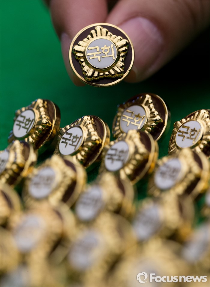 (서울=포커스뉴스) 4.13총선을 이틀 앞둔 11일 오후 서울 여의도 국회에서 20대 국회의원 당선자들이 착용할 배지가 공개되고 있다.