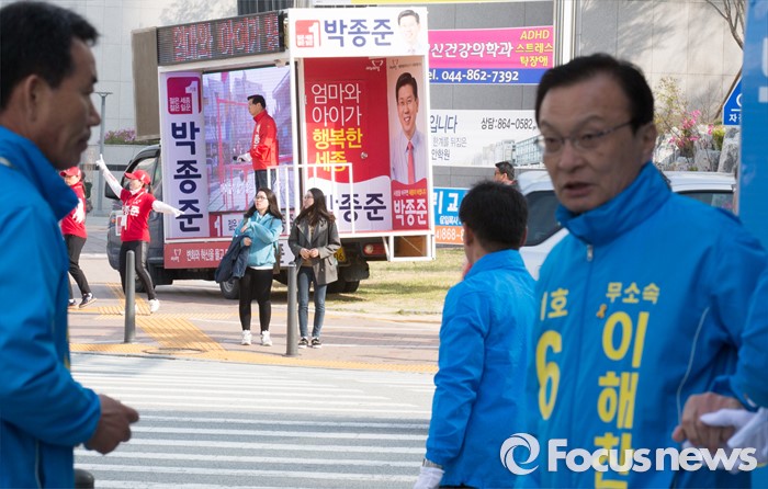 (세종=포커스뉴스) 11일 오전 세종시 절재로 인근에서 박종준 새누리당 후보와 이해찬 무소속 후보가 출근길 선거 유세를 하고 있다.