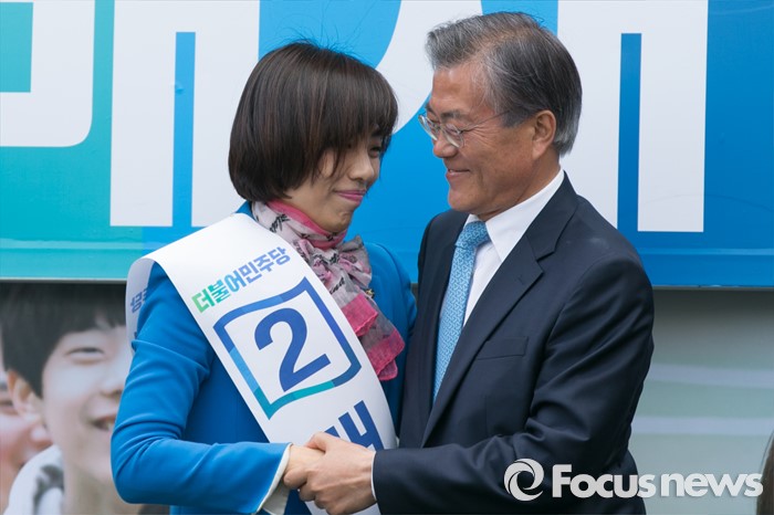 (부산=포커스뉴스) 문재인(오른쪽) 전 더불어민주당 대표가 11일 오후 부산시 사상구 가야대로 주례럭키아파트 앞에서 배재정 더불어민주당 사상 후보 지원유세에 참석해, 배 후보와 손을 잡고 있다.