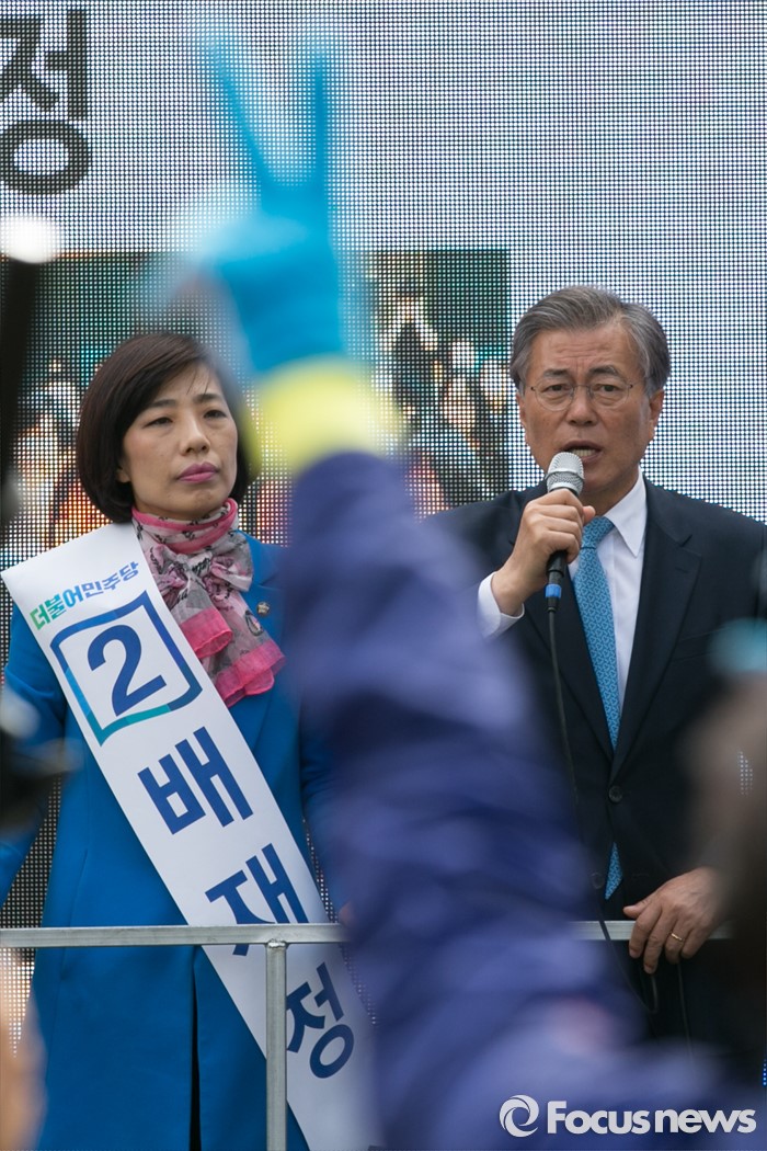 (부산=포커스뉴스) 문재인(오른쪽) 전 더불어민주당 대표가 11일 오후 부산시 사상구 가야대로 주례럭키아파트 앞에서 배재정 더불어민주당 사상 후보 지원유세를 하고 있다.