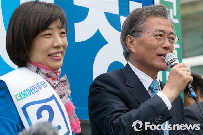 (부산=포커스뉴스) 문재인(오른쪽) 전 더불어민주당 대표가 11일 오후 부산시 사상구 가야대로 주례럭키아파트 앞에서 배재정 더불어민주당 사상 후보 지원유세를 하고 있다.