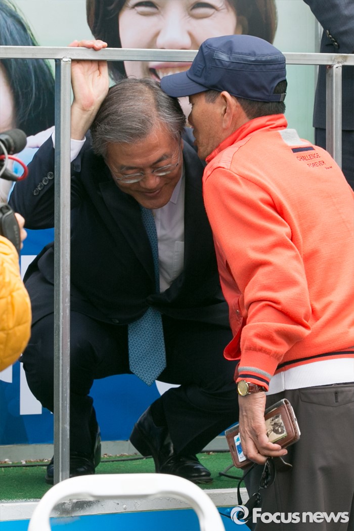 (부산=포커스뉴스) 문재인(왼쪽) 전 더불어민주당 대표가 11일 오후 부산시 사상구 가야대로 주례럭키아파트 앞에서 배재정 더불어민주당 사상 후보 지원유세 중, 시민의 말에 귀를 기울이고 있다.