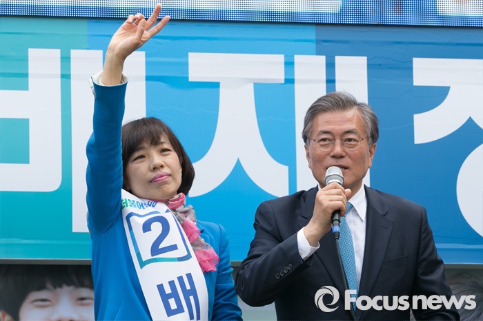 (부산=포커스뉴스) 문재인(오른쪽) 전 더불어민주당 대표가 11일 오후 부산시 사상구 가야대로 주례럭키아파트 앞에서 배재정 더불어민주당 사상 후보 지원유세를 하고 있다.