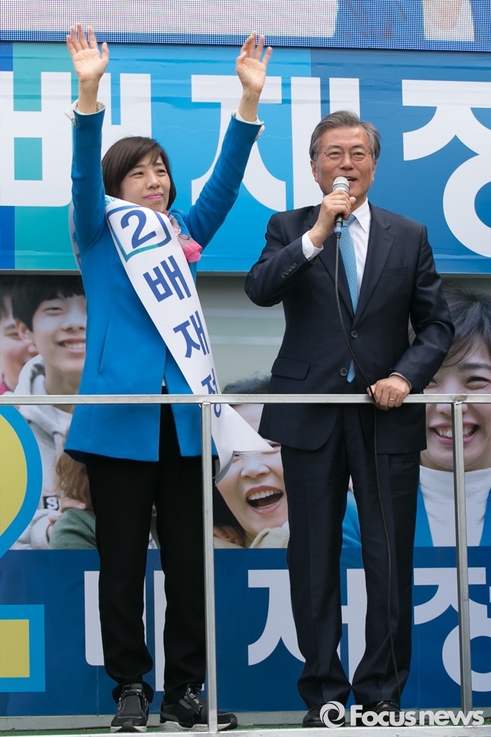 (부산=포커스뉴스) 문재인(오른쪽) 전 더불어민주당 대표가 11일 오후 부산시 사상구 가야대로 주례럭키아파트 앞에서 배재정 더불어민주당 사상 후보 지원유세를 하고 있다.
